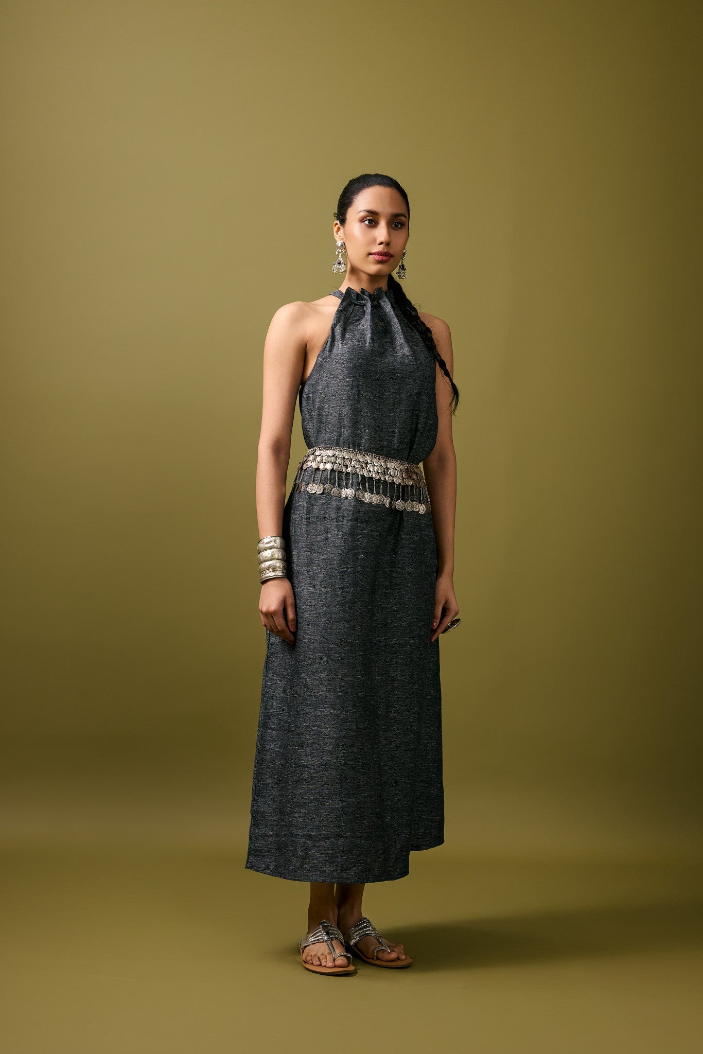 The Ananda Dress in Graphite is a modern classic in 100% linen, designed with the illusion of denim but reimagined in a softer, breathable weave. The halter neckline ties at the back, allowing the bodice to fall into a relaxed drape, while the graphite linen’s textured finish brings a subtle depth that mimics the timeless appeal of denim. This versatile silhouette balances minimal elegance with understated edge - perfect for festive evenings when styled with a metallic statement belt, or pared back for casual daywear and vacations. The dress moves with ease, making it a wardrobe staple for both celebratory occasions and effortless everyday chic.