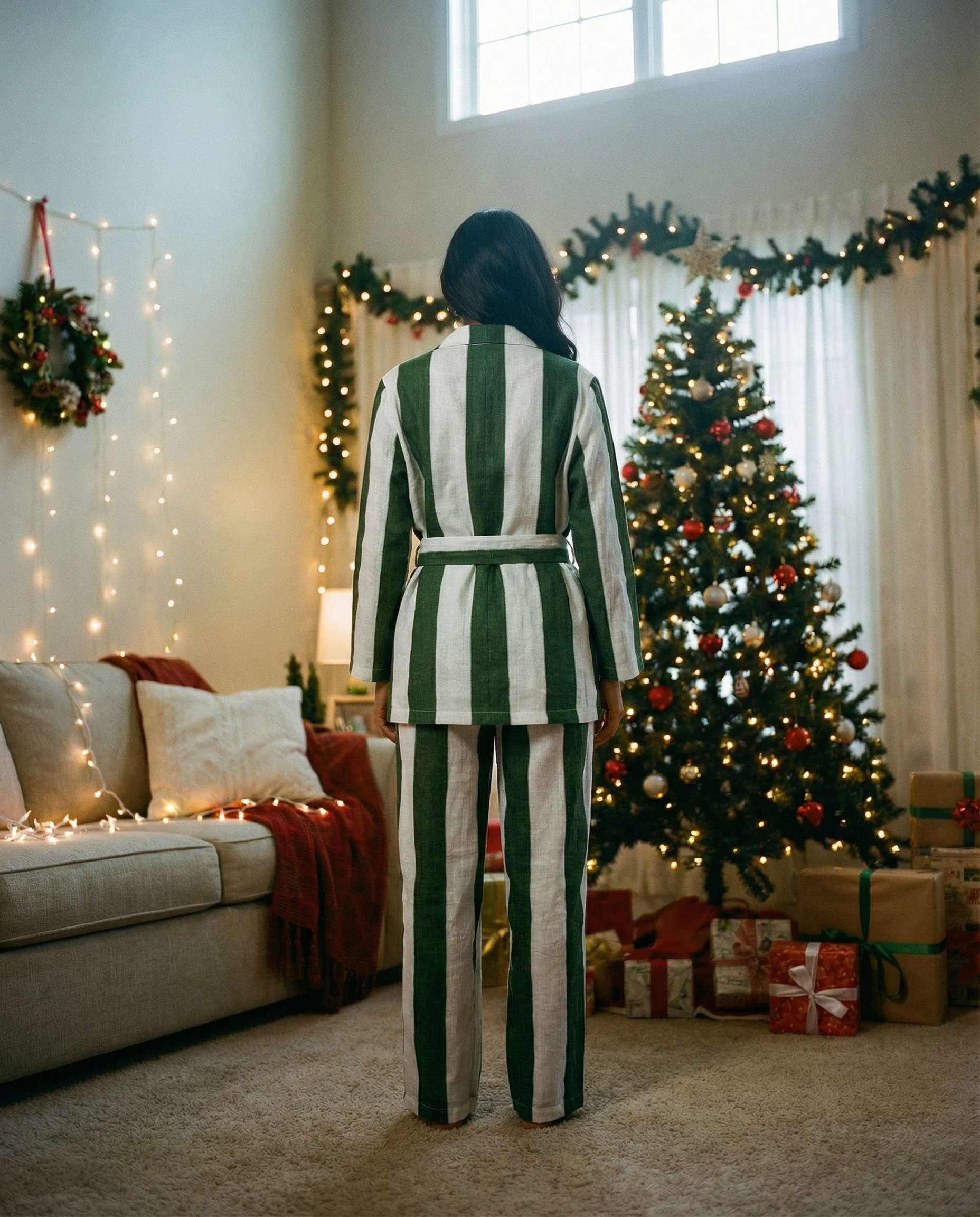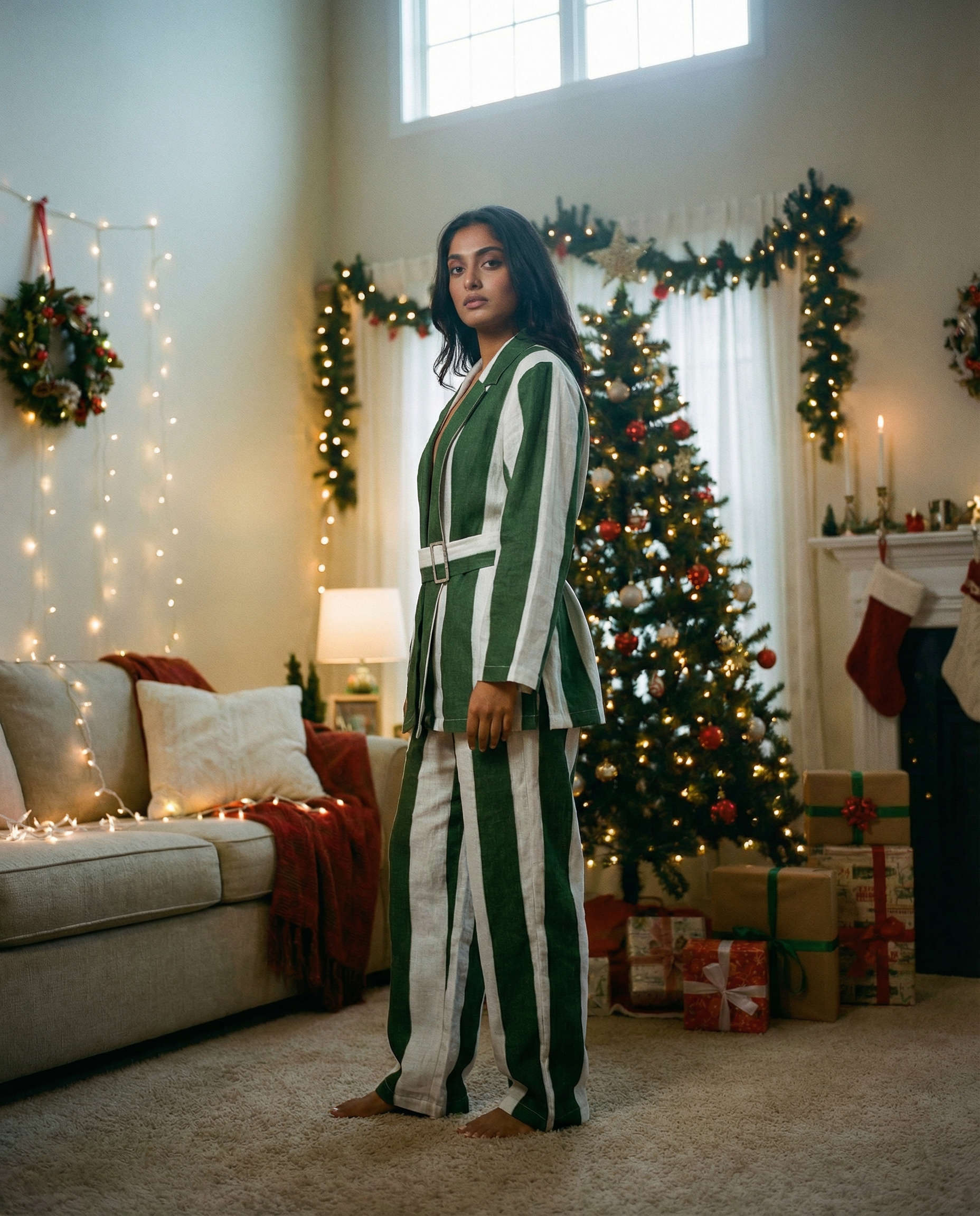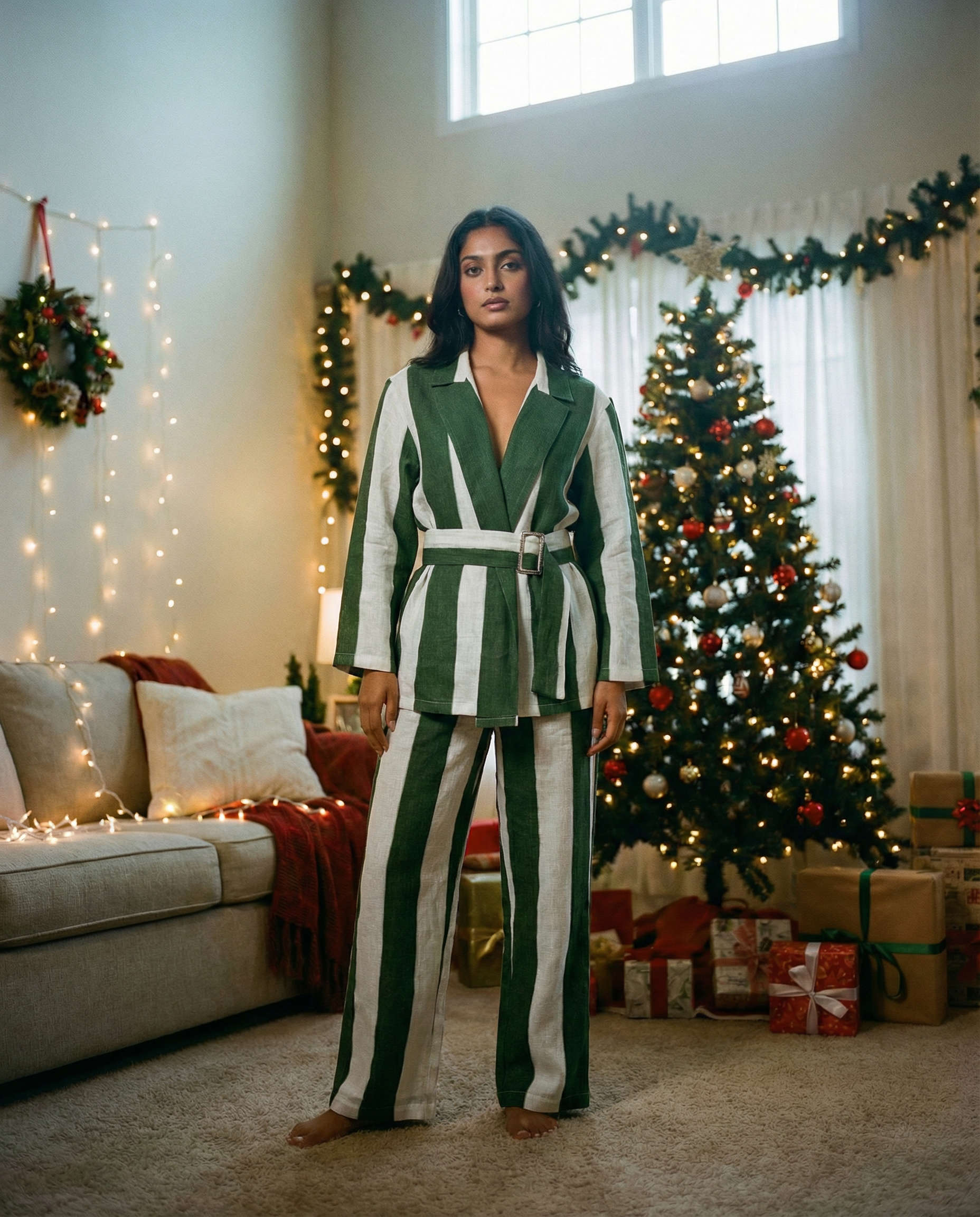 The Cinder Aura Set in Fern brings together relaxed tailoring and comfort-led design in a versatile linen ensemble. Pairing the Cinder Blazer with the straight-fit Aura Pants, this set is designed for ease without sacrificing structure. The blazer’s open silhouette and adjustable belt create a flattering shape, while the pants feature a clean front belt, elasticated back waistband, and functional side pockets for all-day comfort. Finished in a calming fern tone, the set is ideal for slow days, travel, and polished lounging.