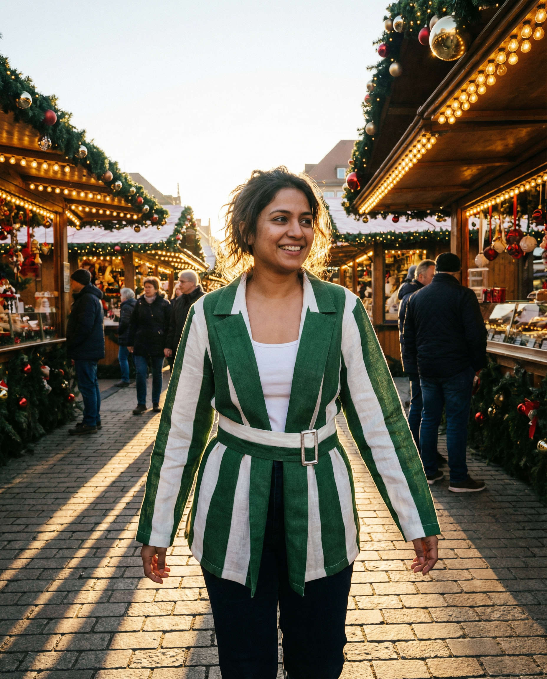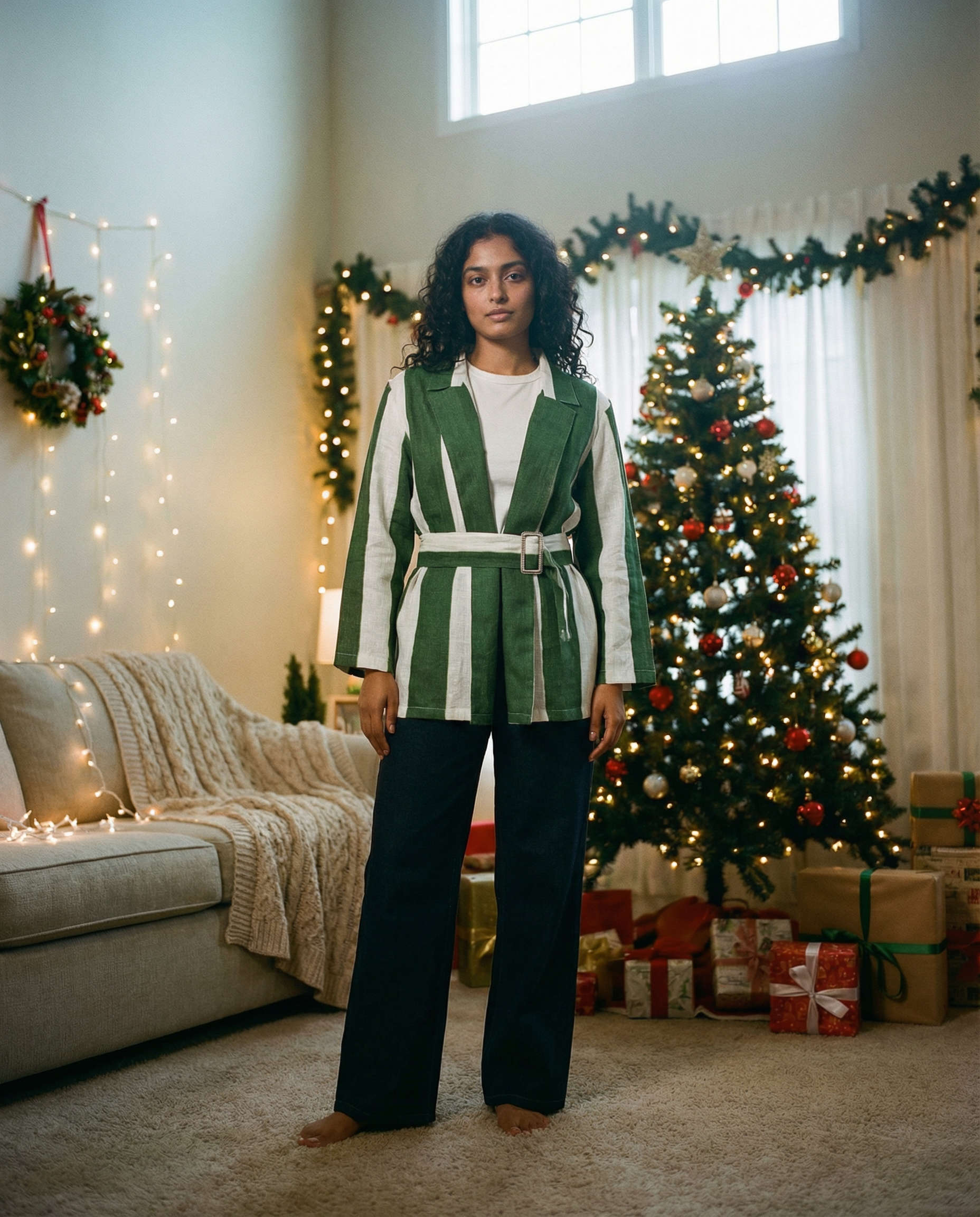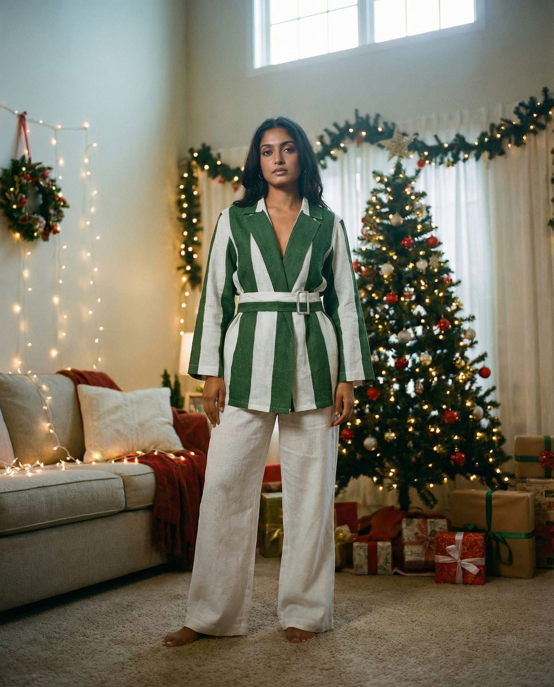 The Cinder Blazer in Fern is a refined statement layer that balances structure with ease. Crafted from breathable linen, this open-front blazer features a tailored yet relaxed silhouette, designed to sit comfortably while still feeling polished. The self-fabric belt allows the waist to be gently cinched for a flattering, adjustable fit, while the bold fern-and-ivory stripe brings a fresh, grounded energy to the piece. Versatile and contemporary, the Cinder Blazer transitions effortlessly from coordinated sets to standalone layering over everyday separates.