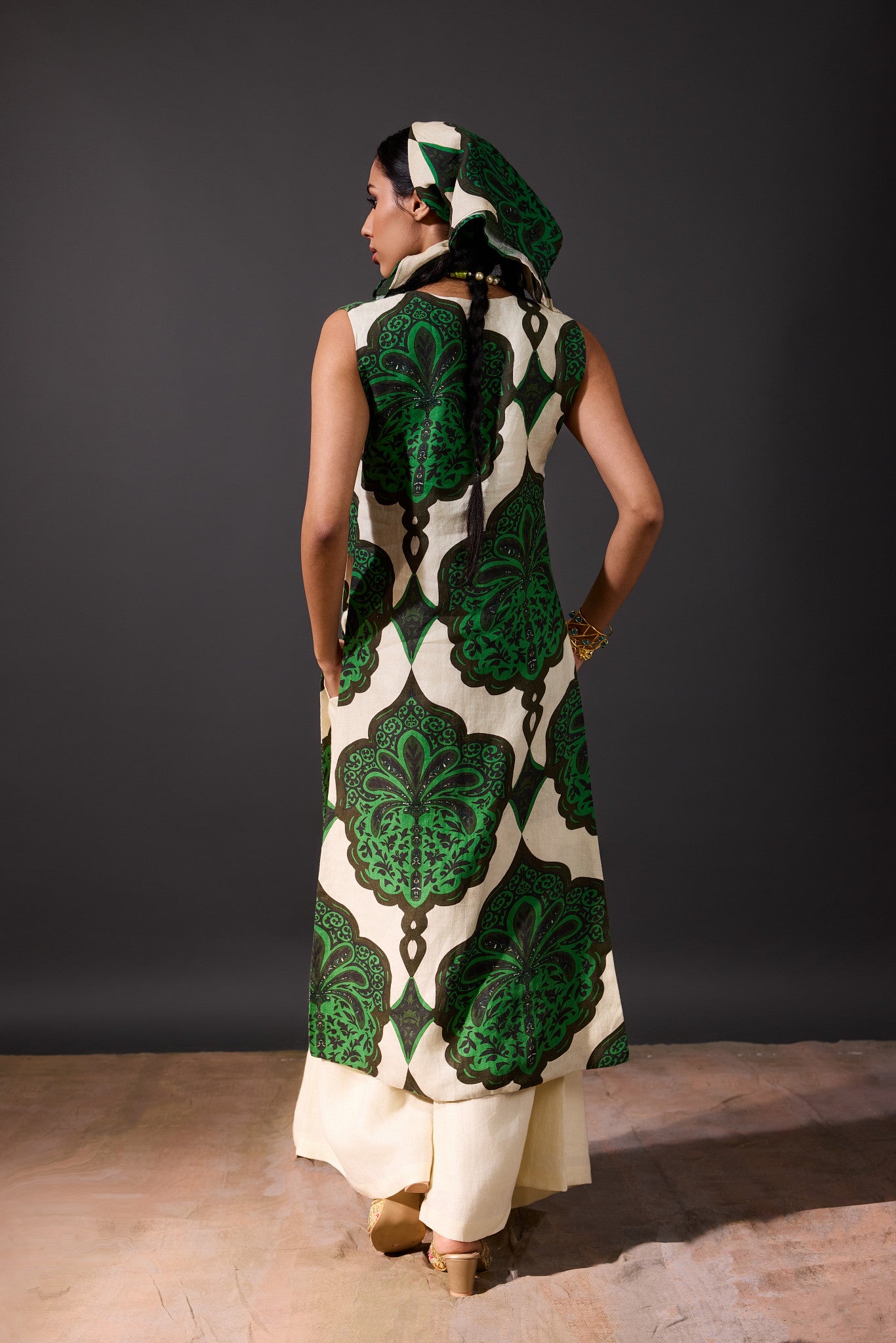 The Saanvi Set in Sage is a regal two-piece ensemble crafted in 100% linen, blending modern elegance with timeless heritage charm. The set features a sleeveless long kurta adorned with bold sage green motifs against a soft ivory base, paired with fluid ivory wide-legged trousers. Designed with deep side slits and practical pockets, the kurta allows ease of movement while remaining striking and festive. The Sage palette of emerald green and ivory lends an aura of richness, making it perfect for Diwali gatherings, puja ceremonies, mehendi rituals, or pre-wedding festivities. Lightweight yet statement-making, this set is ideal for women who want comfort and grandeur in equal measure. Style it with the optional matching headscarf for a complete coordinated look.
