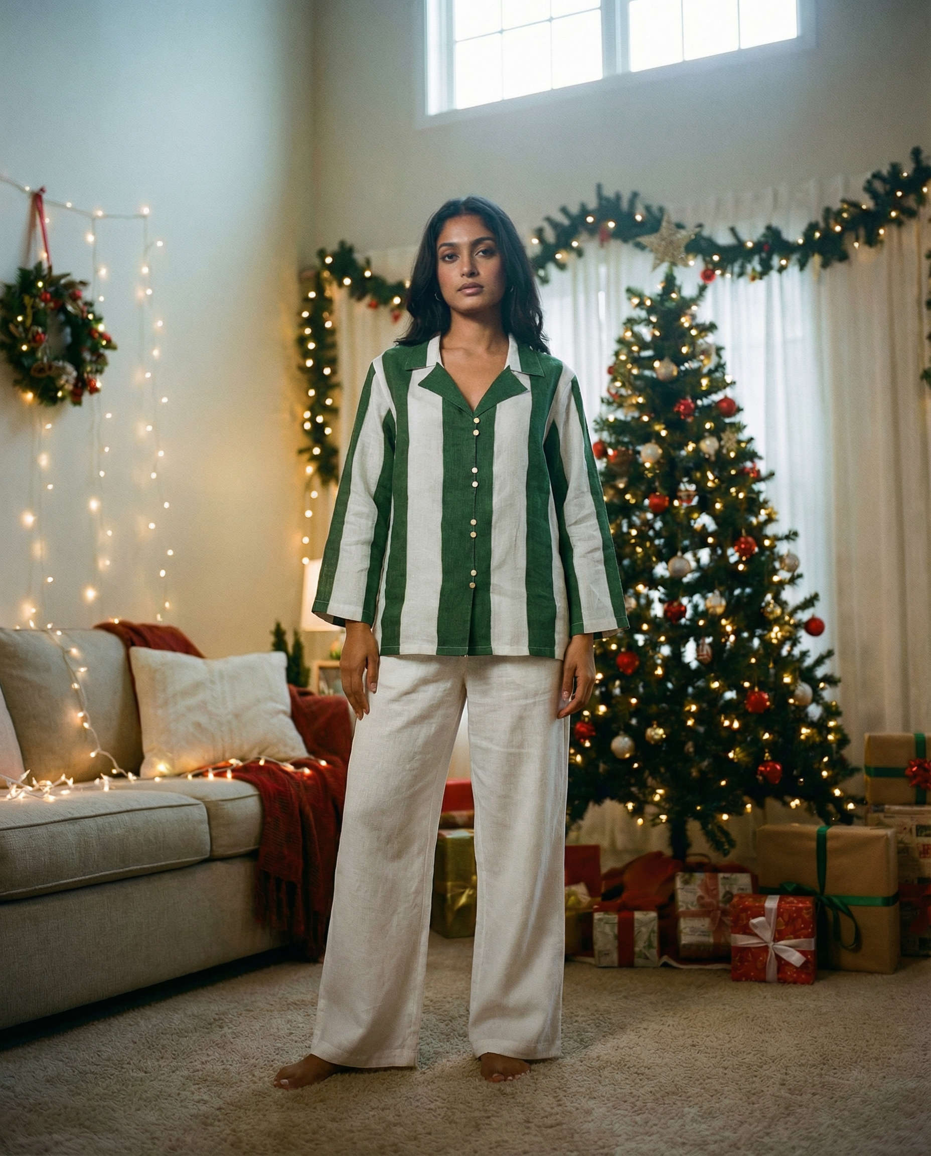 The Serene Shirt in Fern is designed for moments that call for comfort with quiet structure. Crafted from breathable linen, this long-sleeve shirt features a relaxed, straight silhouette with a soft open collar and delicate button detailing down the front. The vertical fern-and-ivory stripe elongates the form while lending a fresh, grounded feel to the piece. Effortless and versatile, the Serene Shirt transitions seamlessly from slow mornings to casual outings, whether worn loose or styled as part of a coordinated set.